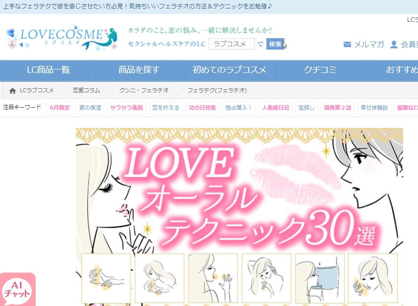 例えば、当サイトでも人気のセクシャルヘルスケア通販サイトであるLCラブコスメさんの公式サイトでは、以下のように『オーラルセックスとフェラチオの30のテクニック』が無料で公開されています。