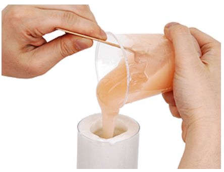 ゆっくりとペニスを引き抜いて、その穴に専用の肌色のゴム素材を流し込みます。これはシリコンという素材で、固まった後にちょうどよい滑らかな人肌感触になるすぐれものですよ!