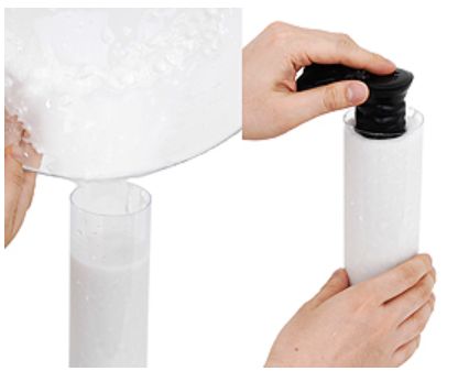 均一にまぜたカタドリ用の白い粉末をカタドリ容器に流し込み、そこに彼のペニスを根本まで挿入します。