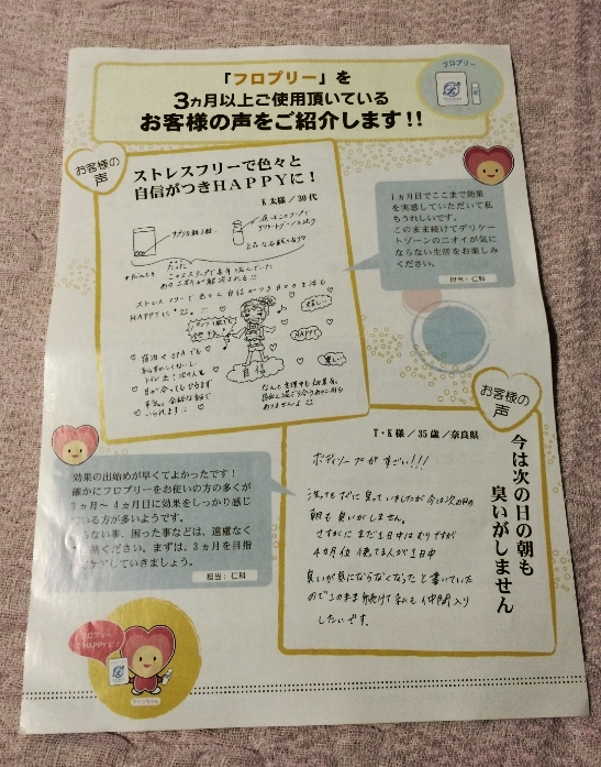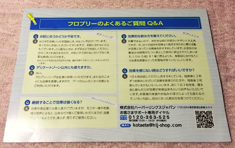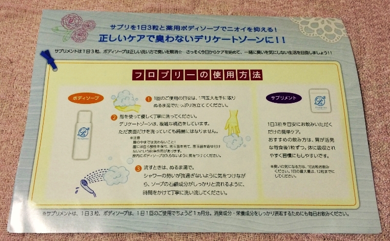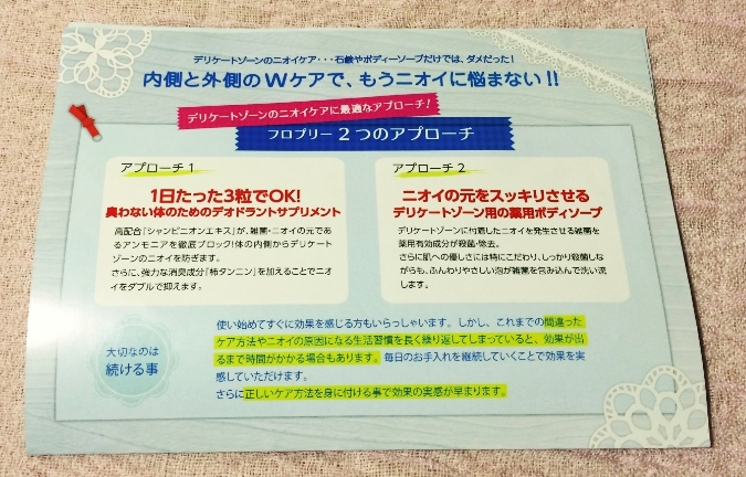 そんな『医薬部外品であるフロプリーの効果的な使い方のコツ』がギュッと濃縮して、一枚のパンフレットにまとまった感じです。なぜ消臭薬用ソープだけではではダメなのか?というポイントや、サプリに含まれている成分の役割なども丁寧に説明されています。