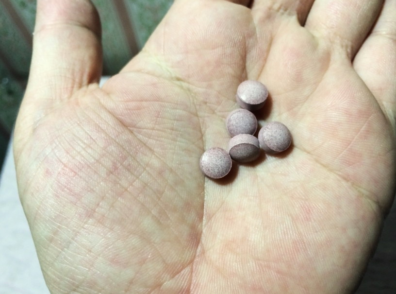 見た目はこんな感じです。小粒できれいな紫色のペレットタイプで、少しブルーベリー風味です。味はすこし苦味あり?って感じです。これも飲み方に少しコツがあるんですよ。実際に同梱されているQ&Aのチラシでも、そのような『毎食後、一粒づつ、合計で一日三粒』という飲み方をお勧めしていますんで。。