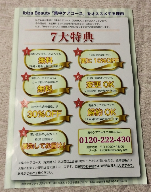 で、どれくらいお徳か?って内容が7大特典として説明されています。姉貴の場合は初回は単品で買って、それ後定期コースに乗り換えたって言ってましたね。