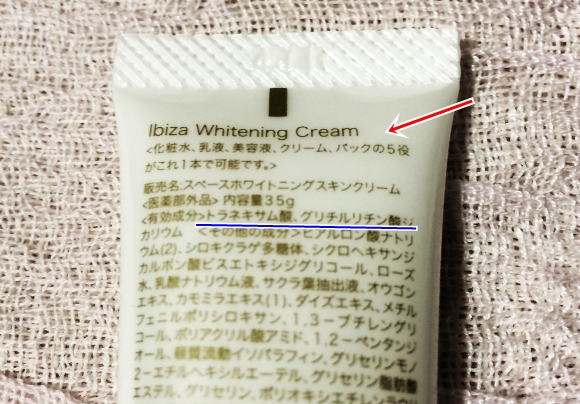 ちょっとクリームの裏側の説明文を拡大してみましたよ。成分に注目!薬用のトラネキサム酸,やグリチルリチン酸以外にも、天然エキスが要注目ですね!
