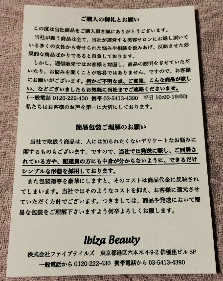 簡単に言うと『いつでも電話してね!』って事と『誰にもばれないように、1円でも安くするために簡易包装にしてますよ』って事が書いてあります。
