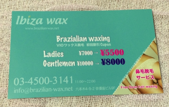 これ、東京在住の女性にとっては嬉しいんじゃじないでしょうか?六本木の『ブラジリアンワックス脱毛サロンIbiza wax』の初回割引クーポンが入ってましたw なにかの間違いではないの?って思ったのですが、間違いではなさそう…