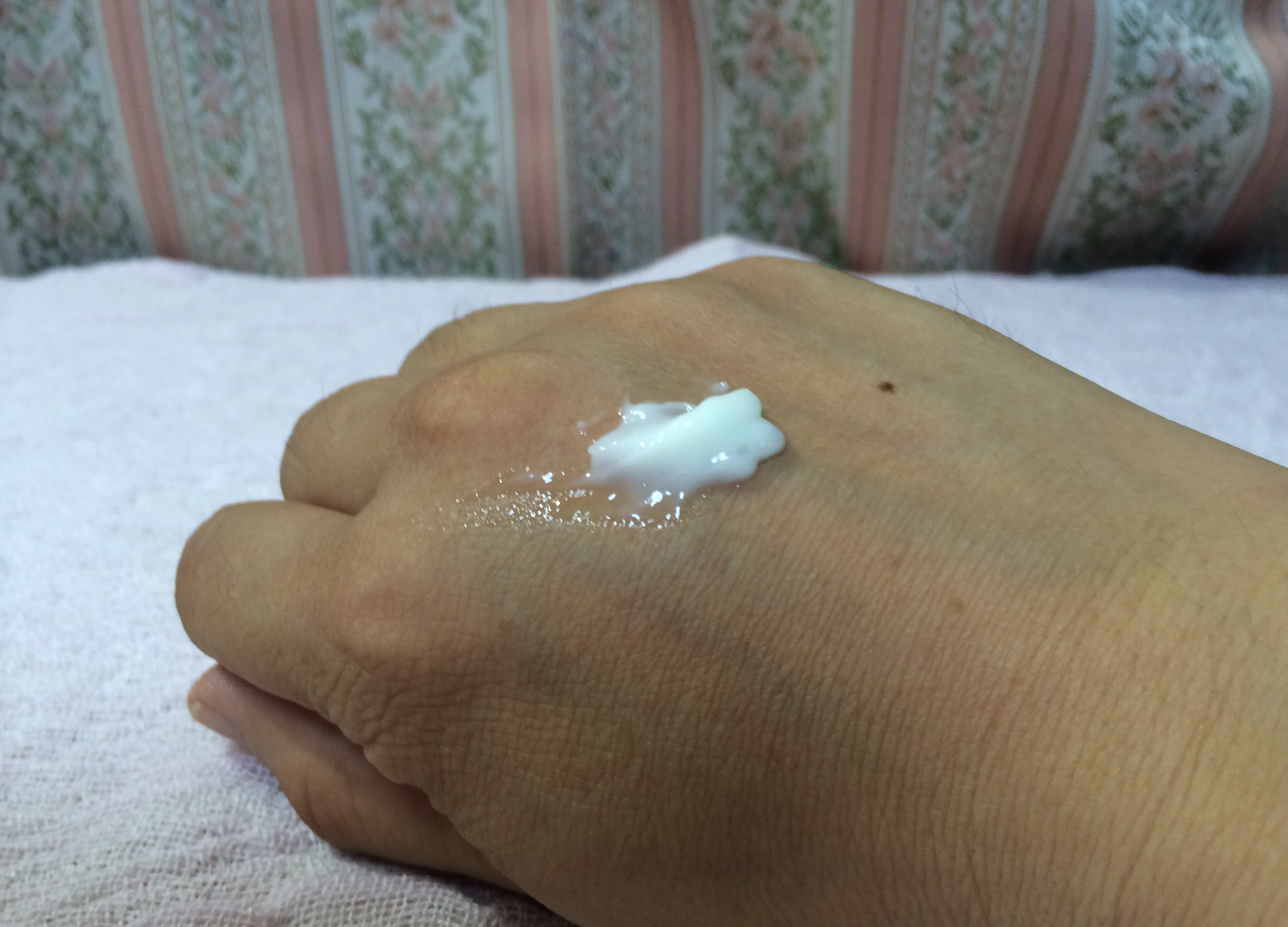 おっさんの手ですみません。ホワイトラグジュアリーってこんな感じの白いクリームです。