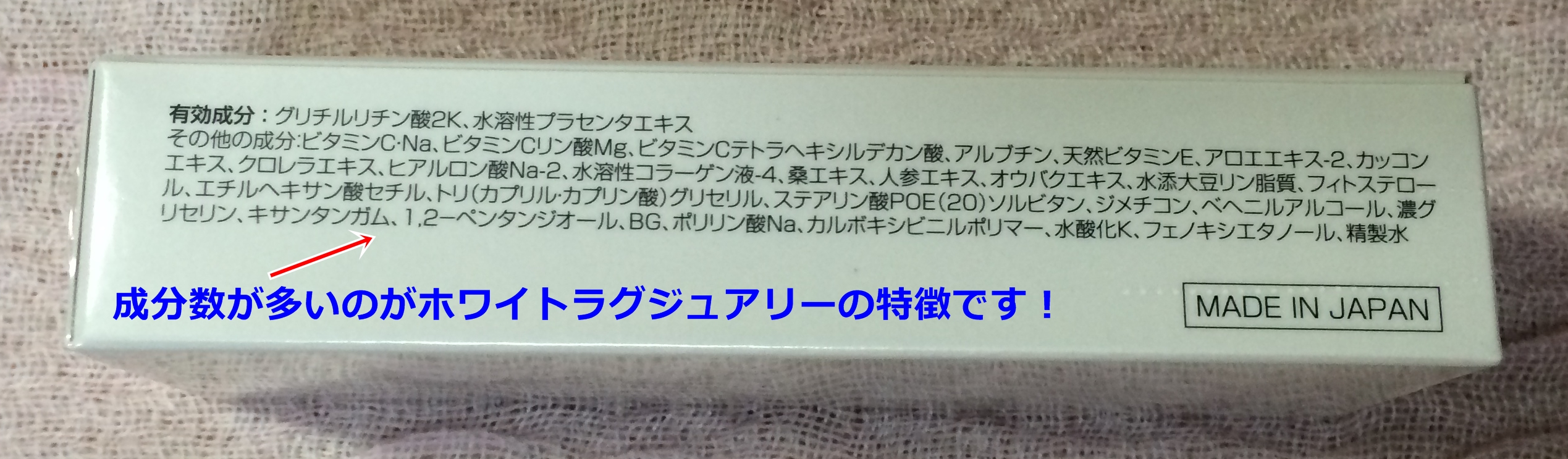 私が思うのは、この二つのコスメの成分を良く見ると、成分バランスの面では、このページでレビューしているホワイトラグジュアリーの方が優れていると思うんですね。