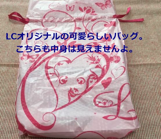 ブルーの梱包シートに包まれていたのは、LCオリジナルの専用バッグでした。この中に今回購入したグッズが入っているってわけですね。そのため、何かの間違いでご家族が荷物を開けたとしても、最後の最後まで中身がわからないっていう仕様です。