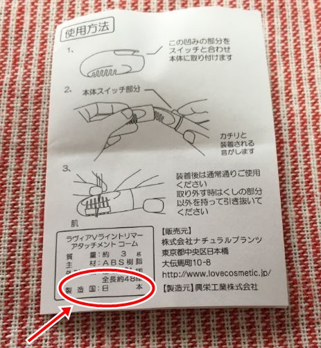 このセットは、アンダーヘア専用のトリマーとしてはお値段がかなり安いです(本体単独でも4000円しないくらい…)。そのため、中国製なんだろなって思っていたのですが、ちゃんと安心と信頼の日本製でしたよ(笑)