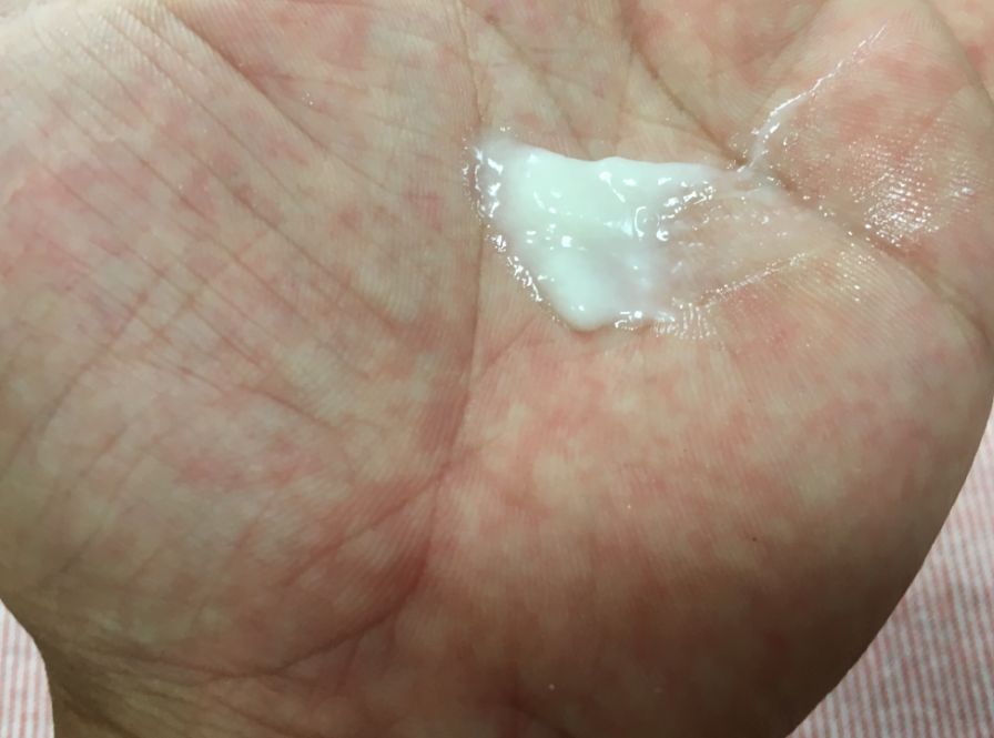 質感は白いクリーム状。一般的なヘアトリートメントよりも固いです。